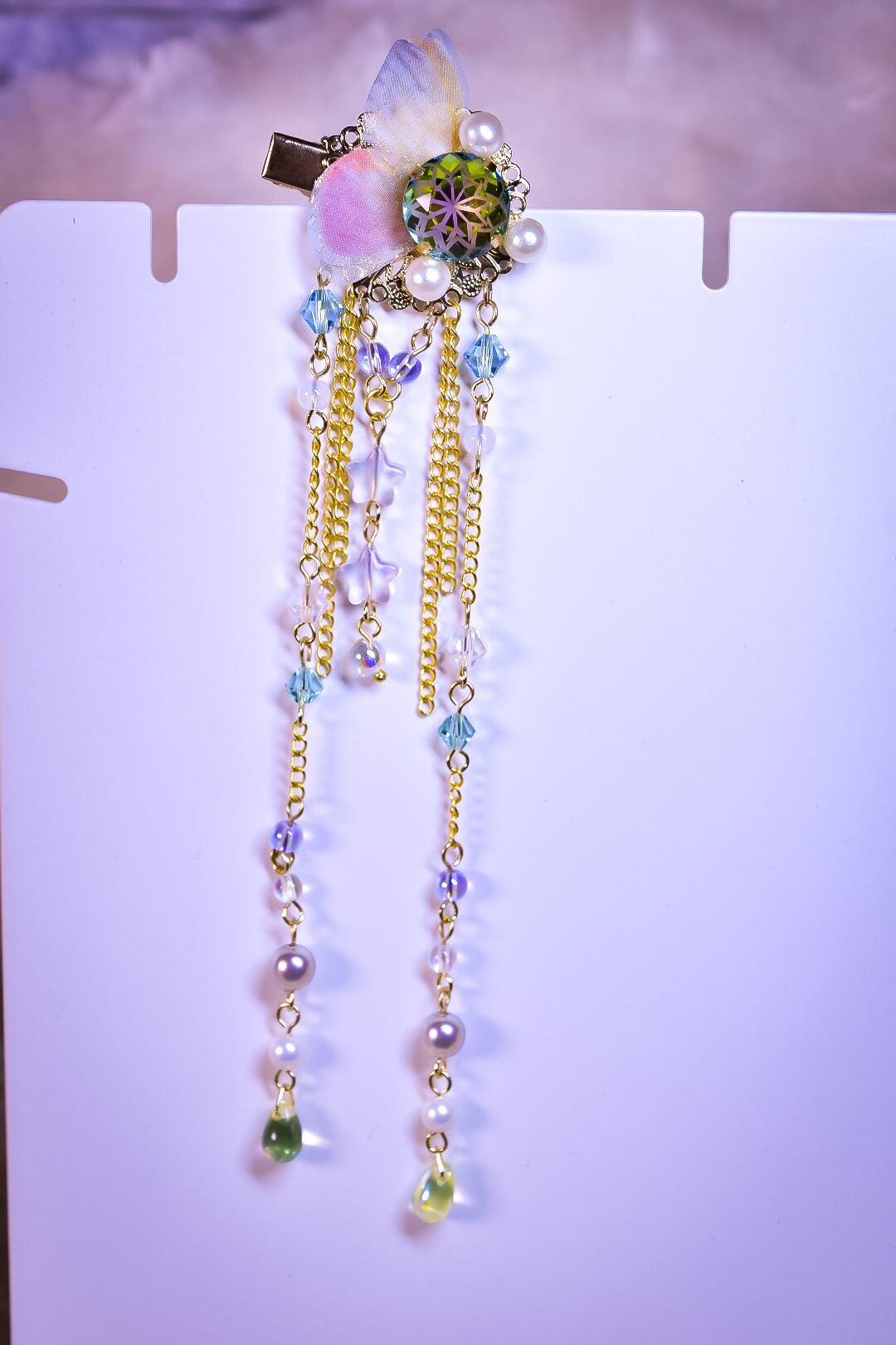 フラワープリントビジューとシフォン蝶々のヘアクリップです。